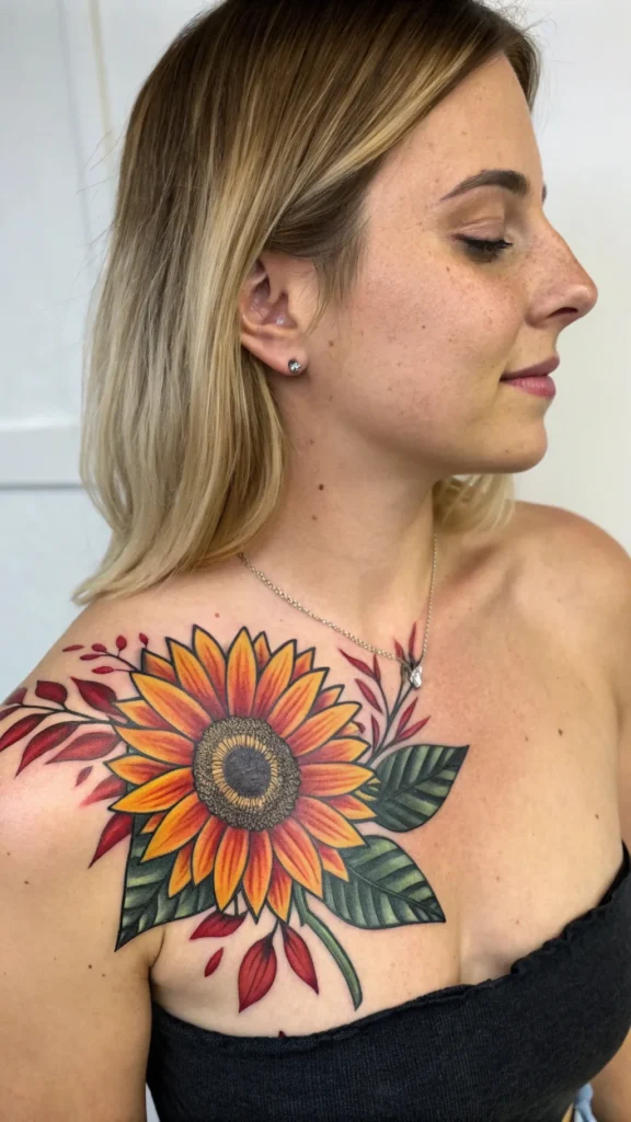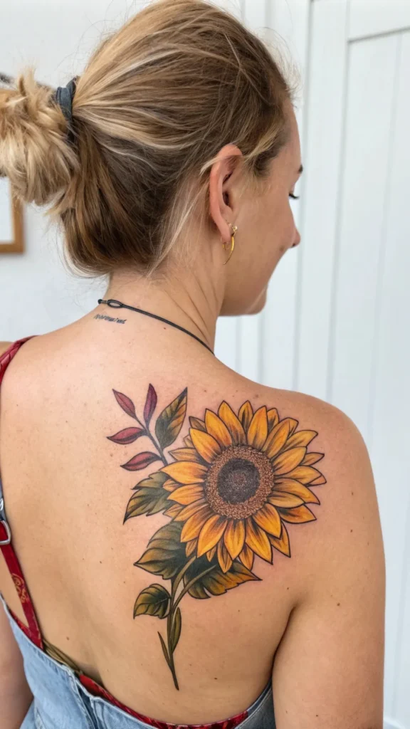 While showcasing your artistic side, a bold sunflower upper back tattoo offers an opportunity to express vibrant, dynamic energy.