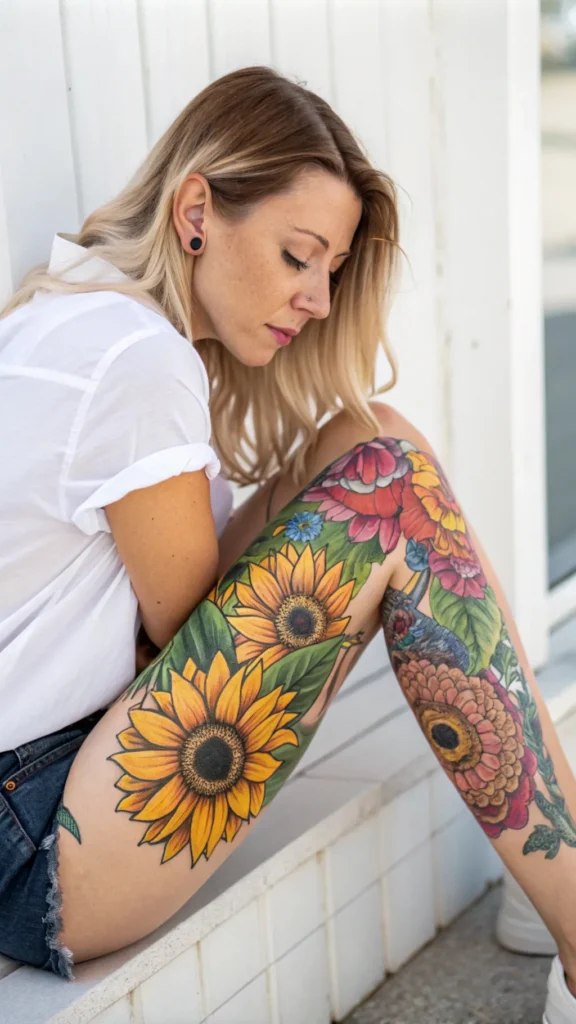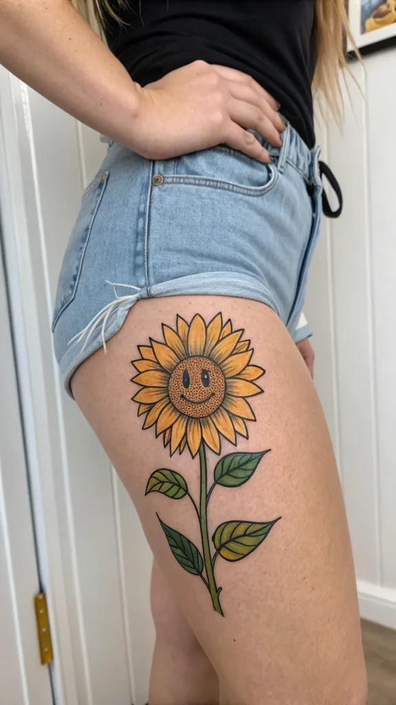 Many sunflower enthusiasts find the thigh to be an ideal location for a whimsical design, as it offers ample space for creative expression and can be easily concealed or revealed.