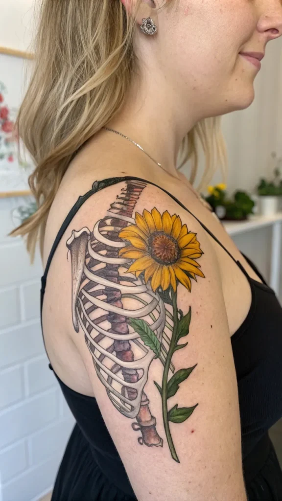 A well-executed realistic sunflower ribcage art can be a breathtaking addition to your body art collection, symbolizing warmth, happiness, and longevity.