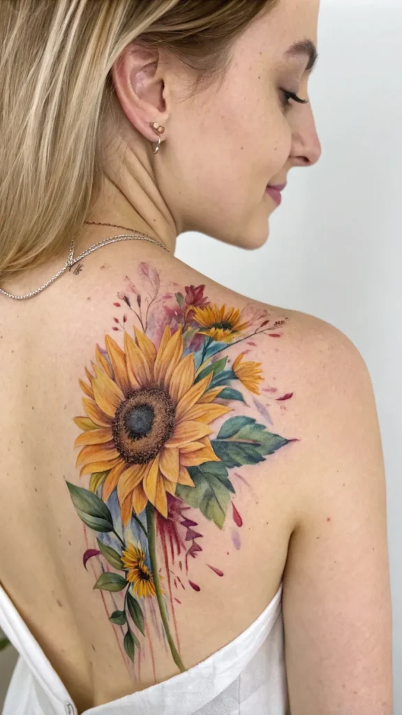 A watercolor sunflower back design can turn your upper or lower back into a vibrant canvas, showcasing your artistic side.